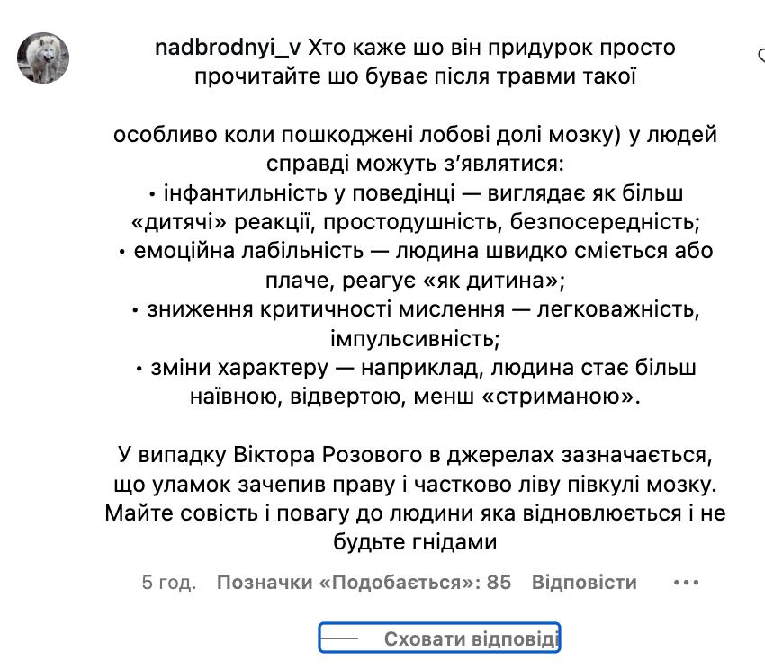На цьому його спілкування з юзерами не закінчилося. Коли один з коментаторів спробував захистити Розового від критики та зазначив, що той отримав важке поранення, яке може вплинути на його когнітивні функції та поведінку, комік відреагував.
