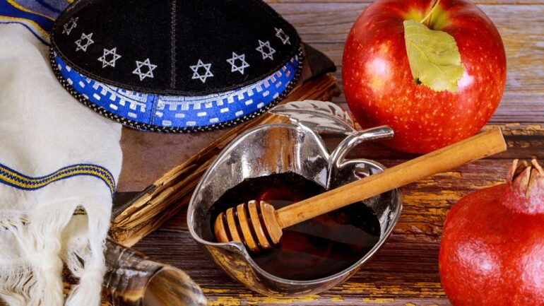 На святковому столі традиційно можна побачити яблука з медом, круглу халу, гранати та інші страви, які символізують солодкий і вдалий рік.
