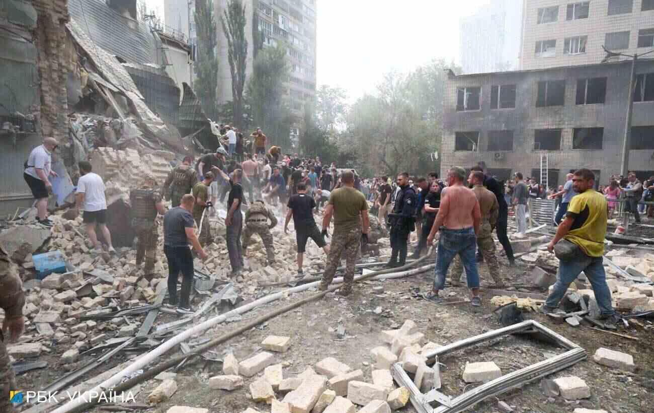 У Києві рятувальники разом з місцевими жителями продовжують розбирати завали зруйнованих будівель, зокрема лікарні "Охматдит". Відомо про велику кількість поранених та загиблих.