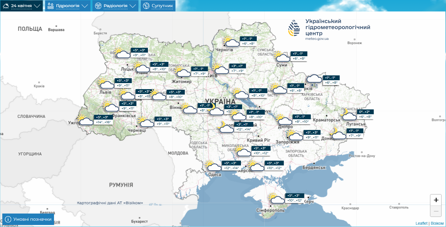Погода по Україні 24 квітня (скриншот: meteo.gov.ua)