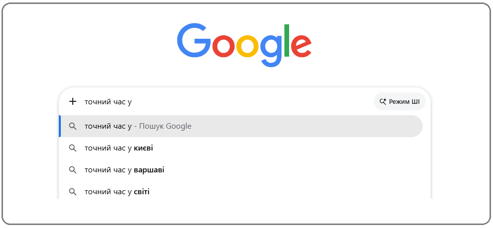 "Запитати" про актуальний в конкретній локації час можна у Google (скриншот: google.com)