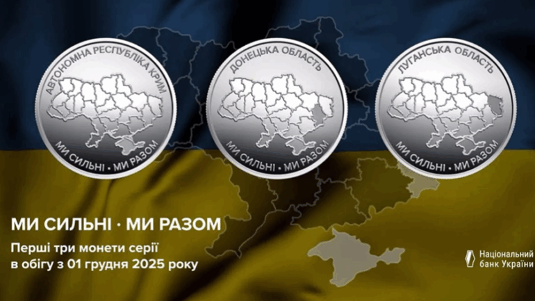 Національний банк України запустив нову тематичну серію обігових пам’ятних монет під назвою «Ми сильні. Ми разом». Вона присвячена Автономній Республіці Крим, Донецькій та Луганській областям.