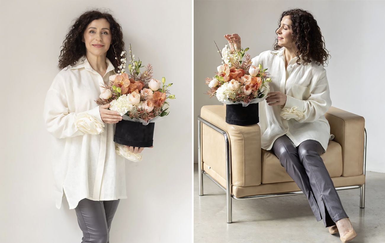 Свій образ Надія доповнила білою оверсайз-сорочкою з оригінальним декором на рукавах у вигляді об'ємних квітів. Таке поєднання грубої фактури шкіри та ніжної тканини верху створює цікавий контраст.