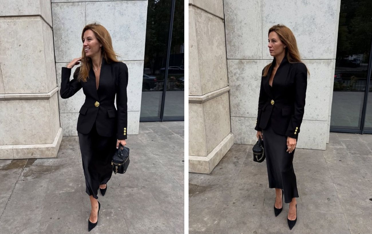 Поєднання стриманої класики (крій) і виразної чуттєвості (глибокий виріз і шовкова спідниця) робить цей лук стильним і підтверджує, що total black ніколи не виходить з моди, якщо правильно погратися з фактурами та силуетами.