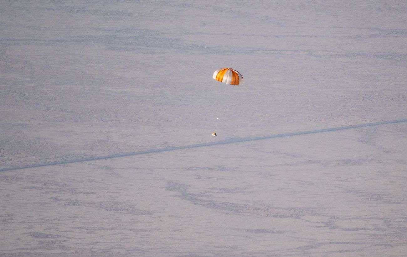 Після входу в атмосферу розкрився парашут "дрога" – менший із двох парашутів на борту капсули, який допоміг забезпечити стійкість, а потім відокремився від капсули. Основний парашут розкрився і загальмував капсулу від гіперзвукової швидкості до швидкості близько 11 миль/год до моменту торкання землі.