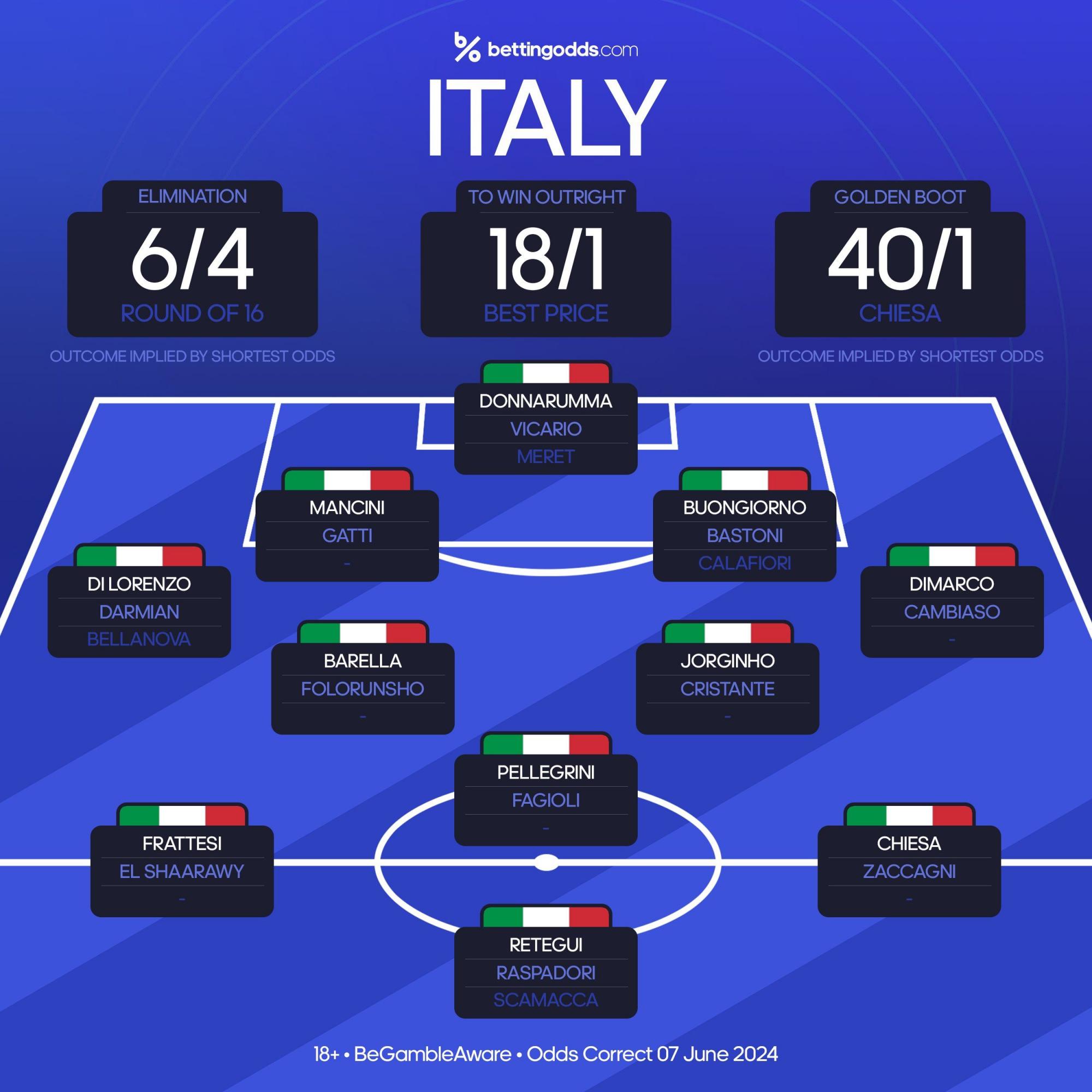 "Скуадра Адзурра" приїхала захищати титул чемпіонів Європи. Італійська збірна входить до когорти традиційних фаворитів великих турнірів. Утім, команду Лучано Спаллетті наразі складно назвати претендентом на збереження європейської корони. Варто пригадати, що у відборі італійці лише за додатковими показниками обійшли збірну України.